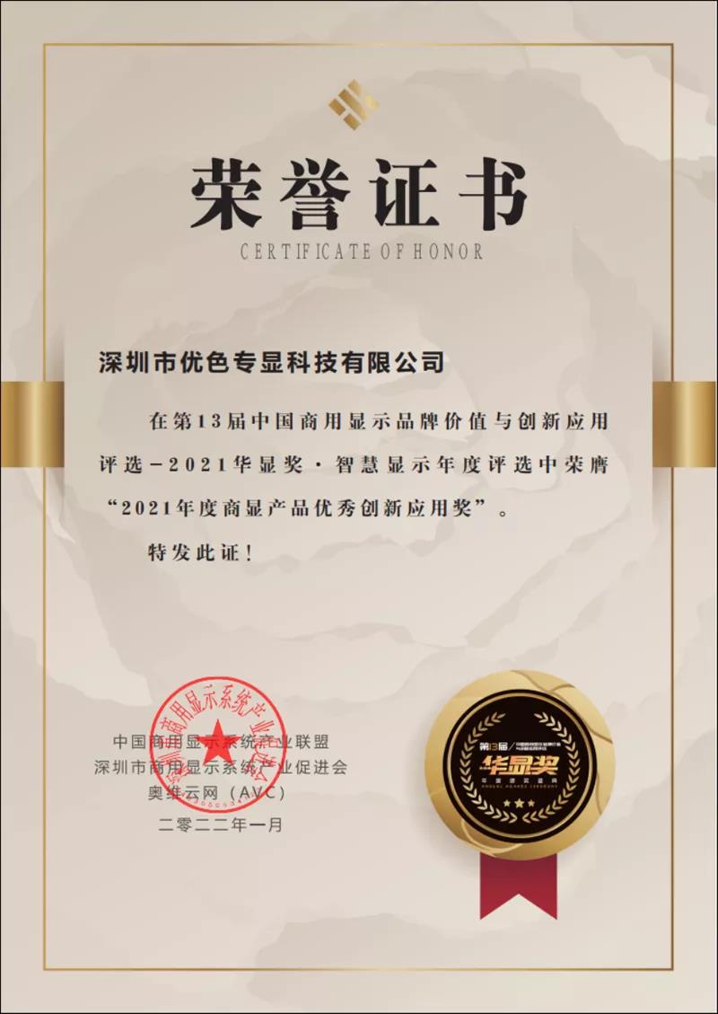 熱烈祝賀優(yōu)色專顯榮獲“2021年度商顯產(chǎn)品優(yōu)秀創(chuàng)新應(yīng)用獎(jiǎng)”-華顯獎(jiǎng)