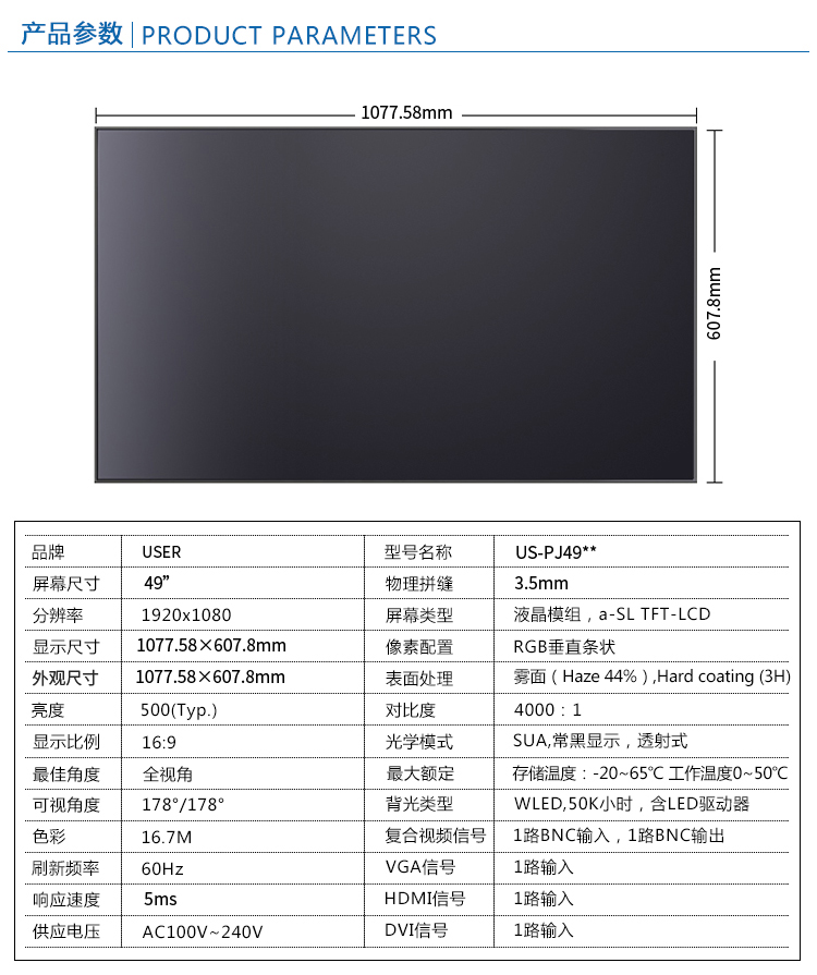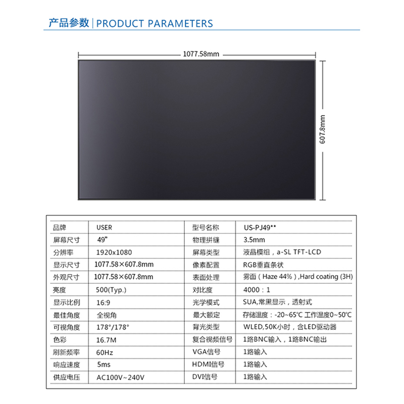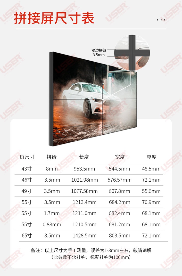 菜單產(chǎn)品中心Product center 液晶廣告機(jī) 壁掛式廣告機(jī) 落地立式廣告機(jī) 電梯超薄廣告機(jī) 車載廣告機(jī) 高亮廣告機(jī) 戶外廣告機(jī) 液晶拼接屏 專業(yè)液晶拼接屏 4K液晶拼接屏 廣告拼接屏 無(wú)縫液晶拼接屏 觸摸液晶拼接屏 LED顯示屏 觸控一體機(jī) 壁掛式觸控一體機(jī) 立式觸控一體機(jī) 斜面觸控一體機(jī) 智能家居觸控一體機(jī) 戶外觸控一體機(jī) 液晶電子白板 教育電子白板 會(huì)議電子白板 工控一體機(jī) 觸摸顯示器 紅外觸摸顯示器 電容觸摸顯示器 電阻觸摸顯示器 聲波觸摸顯示器 納米觸摸顯示器 液晶監(jiān)視器 專業(yè)級(jí)監(jiān)視器 4K監(jiān)視器 嵌入式監(jiān)視器 機(jī)架式監(jiān)視器 開放式監(jiān)視器 SDI監(jiān)視器 高亮監(jiān)視器 廣播級(jí)監(jiān)視器 工業(yè)顯示器 4K顯示器 機(jī)架式顯示器 開放式顯示器 醫(yī)療顯示器 KVM顯示器 指揮室顯示器 智慧校園產(chǎn)品 專業(yè)定制商顯 多屏廣告機(jī) 多功能觸控一體機(jī) 多功能廣告機(jī) 微信打印廣告機(jī) 魔鏡廣告機(jī) 透明廣告機(jī) 全息廣告機(jī) 條形屏廣告機(jī) 旋轉(zhuǎn)廣告機(jī) 裸眼3D廣告機(jī) 人工智能產(chǎn)品 顯示配套設(shè)備 拼接配套設(shè)備 廣告機(jī)播放盒 OPS播放盒 拼接支架 移動(dòng)支架 相關(guān)軟件 吊頂支架 線材 木架 蜂窩箱 桌面底座 熱門產(chǎn)品 →優(yōu)色3.5mm超窄邊46寸液晶拼接屏→優(yōu)色49寸3.5mm超窄邊液晶拼接屏→優(yōu)色3.5mm超窄邊55寸液晶拼接屏 您的位置:首頁(yè) → 公司產(chǎn)品 → 液晶拼接屏 → 專業(yè)液晶拼接屏 優(yōu)色49寸3.5mm超窄邊液晶拼接屏類別:專業(yè)液晶拼接屏 簡(jiǎn)介:◆ 型號(hào):US-PJ49** ◆類型:三星/LG/京東方BOE面板 ◆亮度:500-700cd/m2(可選) ◆超窄邊設(shè)計(jì),拼縫3.5mm ◆ 在ISO9001嚴(yán)格的質(zhì)量控制體系下生產(chǎn)? ◆ 色彩均勻,圖像穩(wěn)定,為拼接大畫面定制... 在線咨詢 返回列表 產(chǎn)品說(shuō)明 相關(guān)產(chǎn)品 優(yōu)色1.7mm超窄邊55寸液晶拼接屏 優(yōu)色49寸1.8mm超窄邊液晶拼接墻 優(yōu)色49寸3.5mm超窄邊液晶拼接屏 優(yōu)色3.5mm超窄邊55寸液晶拼接屏 優(yōu)色3.5mm超窄邊46寸液晶拼接屏 優(yōu)色5.3mm超窄邊55寸液晶拼接屏