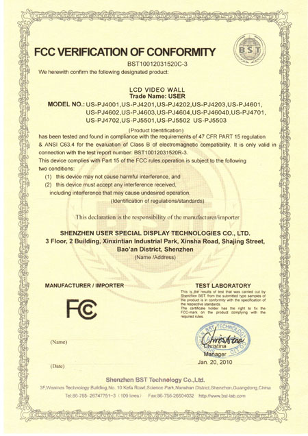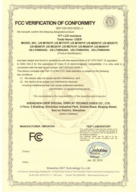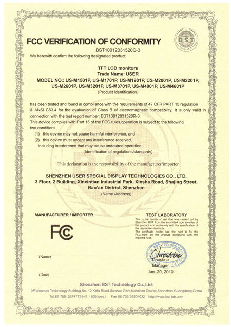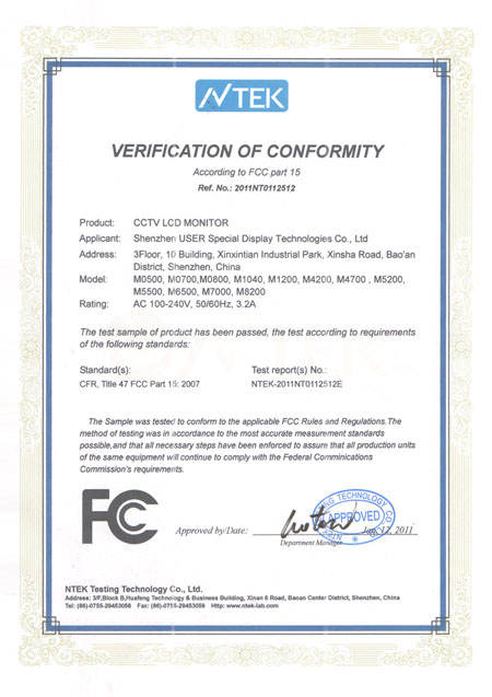 FCC認(rèn)證歐盟認(rèn)證(液晶監(jiān)視器合格證明證書(shū))